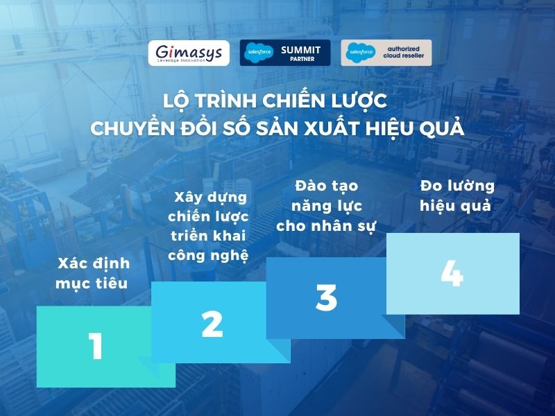 Dưới đây là lộ trình 4 bước được các chuyên gia Gimasys đề xuất cho doanh nghiệp Sản xuất tại Việt Nam nhanh chóng thực hiện mục tiêu chuyển đổi số, đẩy mạnh tăng trưởng và nâng cao vị thế cạnh tranh.