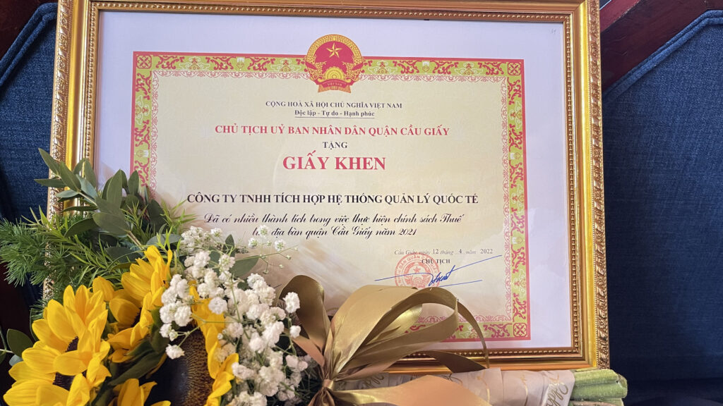 Không chỉ đóng góp vào tình hình kinh tế chung, các doanh nghiệp, doanh nhân trên địa bàn quận còn sát cánh với Chính quyền, thực hiện tốt các chủ trương, chính sách về Thuế. Gimasys là một trong những doanh nghiệp vinh dự nhận được giấy khen: “Có nhiều thành tích trong việc thực hiện chính sách Thuế trên địa bàn quận Cầu Giấy năm 2021”