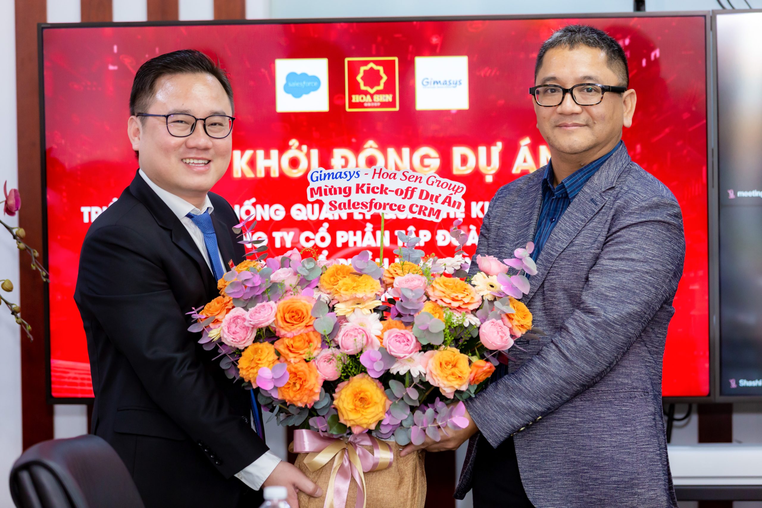 Ban lãnh đạo Tập đoàn Hoa Sen gửi tặng hoa ông Đinh Kiến Quốc – Tổng Giám đốc Gimasys (bên phải)