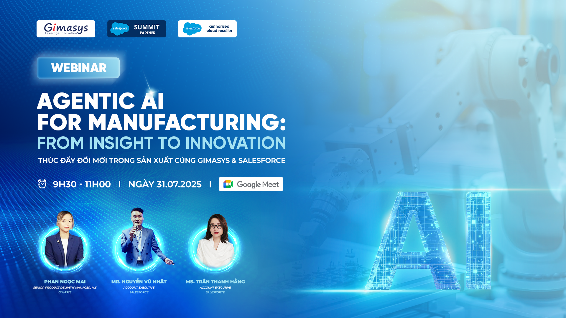 Trong bối cảnh ngành sản xuất Việt Nam đang trải qua cuộc cách mạng số mạnh mẽ, khi khách hàng B2B ngày càng đòi hỏi trải nghiệm B2C và các thách thức vận hành trở nên phức tạp hơn bao giờ hết, Gimasys – Đối tác hạng Summit Partner của Salesforce tại Việt Nam – đã phối hợp tổ chức thành công hội thảo “Agentic AI for Manufacturing: From Insight to Innovation” vào ngày 31.07.2025.