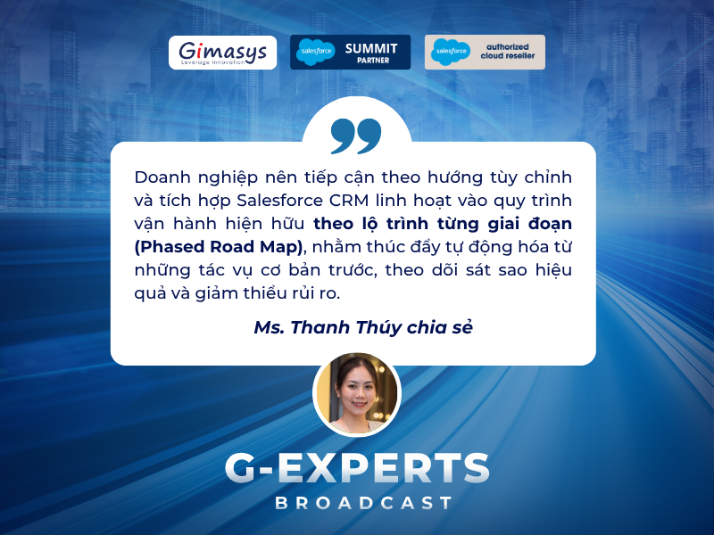 Đứng trước câu hỏi này, chuyên gia Gimasys – Ms. Thanh Thúy chia sẻ: “Doanh nghiệp nên tiếp cận theo hướng tùy chỉnh và tích hợp Salesforce CRM linh hoạt vào quy trình vận hành hiện hữu theo lộ trình từng giai đoạn (Phased Road Map) nhằm thúc đẩy tự động hóa từ những tác vụ cơ bản trước, theo dõi sát sao hiệu quả và giảm thiểu rủi ro.”