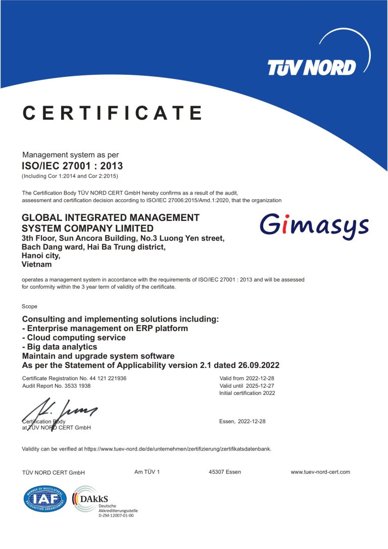 Tháng 12/2022 vừa qua, Gimasys chính thức nhận được chứng chỉ ISO/IEC 27001 về bảo mật thông tin theo tiêu chuẩn quốc tế. Việc bảo mật thông tin và dữ liệu an toàn tại Gimasys luôn được Ban lãnh đạo đặt lên hàng đầu. Để giải quyết được vấn đề này, cũng như có một […]