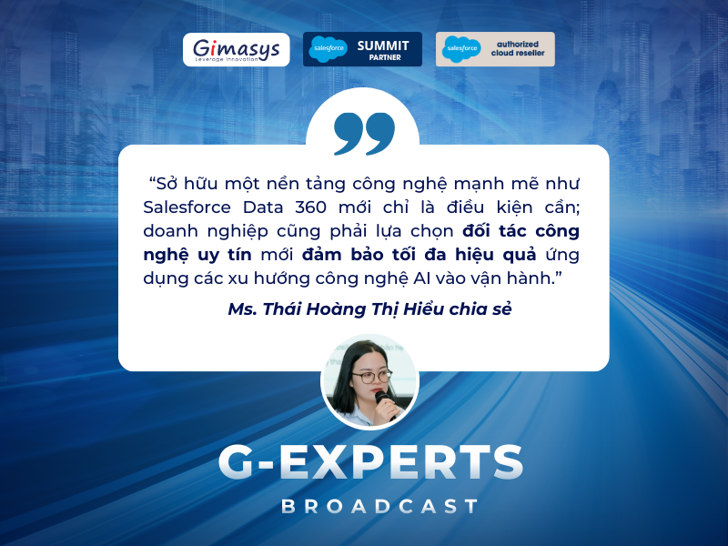 Với vai trò là đối tác số 1 của Salesforce tại Việt Nam, Gimasys đảm bảo triển khai thành công Data 360 theo phương pháp luận bài bản và đồng hành sát sao trong từng giai đoạn: từ tư vấn, đánh giá hiện trạng hạ tầng dữ liệu, thiết kế giải pháp đến kiểm thử và nghiệm thu. Vì vậy, giúp doanh nghiệp khai thác trọn vẹn giá trị của Data 360 nhằm kiến tạo nền móng dữ liệu vững chắc, đáng tin cậy và xuyên suốt toàn tổ chức, phục vụ cho việc ứng dụng công nghệ và AI vào vận hành thực sự.