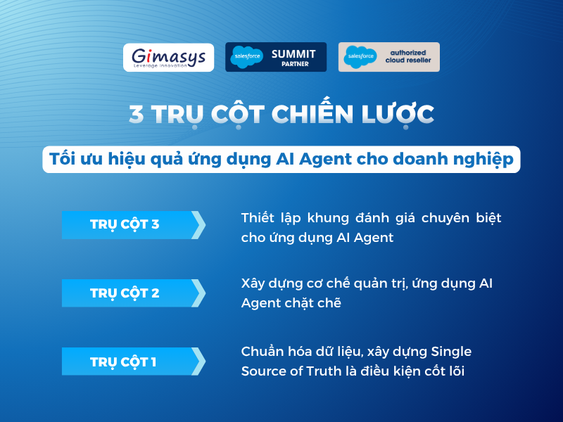 Vì vậy, trước thực trạng này, các chuyên gia Gimasys đã nghiên cứu và đề xuất 3 trụ cột chiến lược ưu tiên giúp doanh nghiệp Việt Nam xây dựng định hướng ứng dụng AI Agent hiệu quả. Cùng tìm hiểu chi tiết tại bài viết dưới đây!